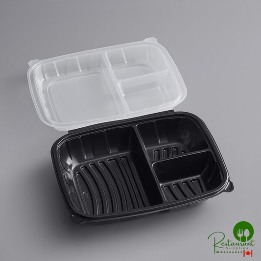 • 11" x 8 1/2" x 3" Microwaveable 3-Compartment Black / Clear Plastic Hinged Container By Prime - 100/Case