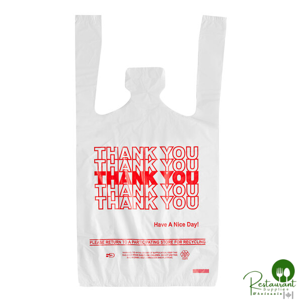 Offer your customers a convenient and professional carrying solution with these Prime standard-duty plastic t-shirt bags. Crafted from durable high-density polyethylene (HDPE), these bags provide reliable strength to handle everyday items without rips or tears. The classic white finish and printed "Thank You" graphic convey a courteous, appreciative message with every purchase.