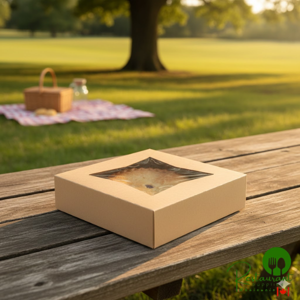 The clear viewing window creates an attractive display that increases impulse sales. The unmarked kraft surface serves as a blank canvas for custom labels, stamps, or branding elements, allowing for quick personalization that matches your bakery's aesthetic.