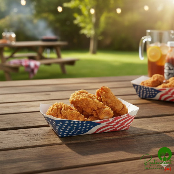 Easily serve a wide variety of tasty finger foods, freshly made sides, and signature snacks with this USA flag paper food tray. Versatile in both design and use, the tray is perfect for french fries, chicken tenders, mozzarella sticks, and other popular fried favorites, or with cold items such as veggies, fruit, and pasta salad.
