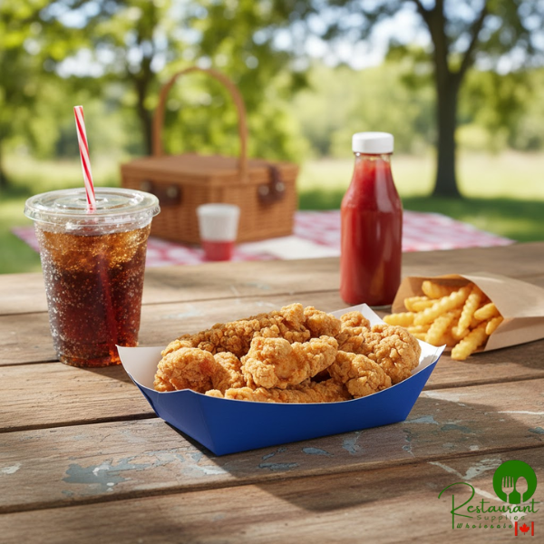 Versatile Applications: Ideal for concession stands, food trucks, stadiums, fairs, catering events, and any food service operation needing reliable, disposable food trays with appealing blue presentation.