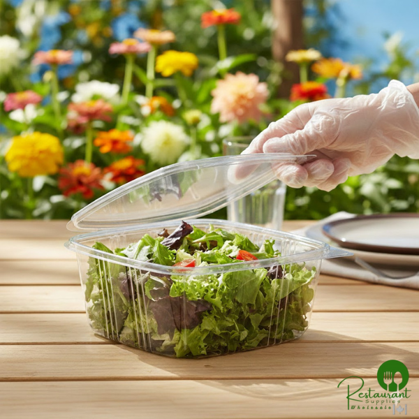 Perfect for deli counters, take-out services, catering operations, and food displays where excellent product visibility and eco-friendly packaging are important. The large 48 oz. capacity makes it ideal for family-sized portions, bulk salads, catering orders, and generous side dishes, while the hinged design provides convenient access for customers. The clear RPET material showcases your culinary creations while supporting environmental sustainability in a generously sized container perfect for today's food service needs.