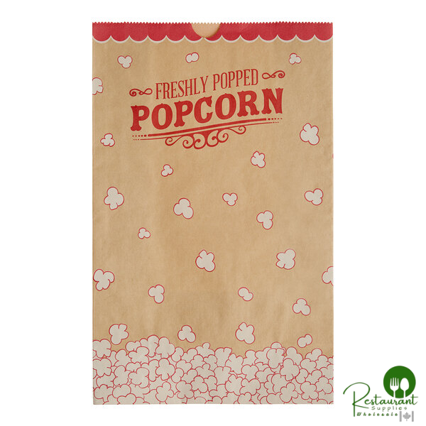 Complement the irresistible aroma and buttery taste of your popcorn with these Prime 7½" x 3½" x 12" 170 oz. extra-large kraft popcorn bags. Each bag holds a massive 170 ounces of hot, freshly popped popcorn, ideal for family-sized portions and high-volume entertainment venues.