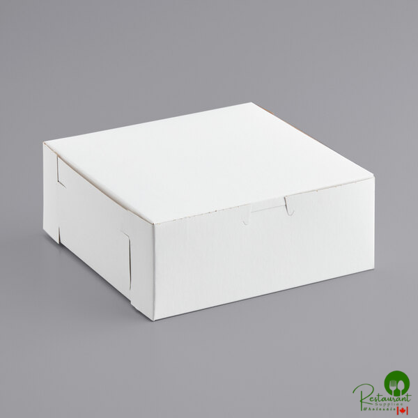 Entice your customers into taking home your delicious pies, cookies, or muffins with this 8" x 8" x 3" white pie/bakery box. The one piece design allows the lid to be opened easily and then tucked back into place to secure the contents. Make sure your bakery is complete by providing a durable cake box for your customers!