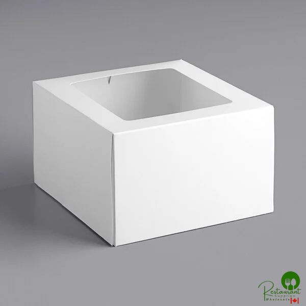 Expertly package decadent desserts with this 8" x 8" x 5" white auto-popup window bakery box! Perfect for merchandising pies, cakes, and pastries at your bakery, this innovative packaging solution combines stunning product visibility with effortless assembly. The large crystal clear window beautifully showcases your creations while the auto-popup design streamlines your packaging process.