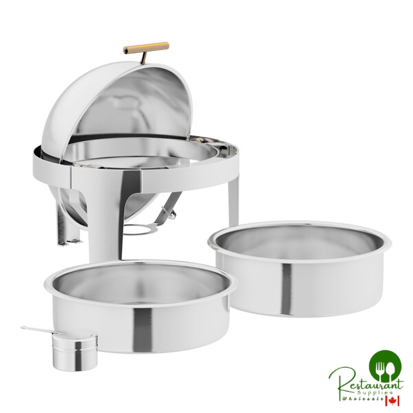Elevate your buffet presentations with this elegant round chafer featuring luxurious gold accents. The complete set includes everything needed for professional food service: inset water pan, roll-top cover, frame, and fuel holder. Slightly-curved legs and a circular base provide both stability and sophisticated visual appeal.