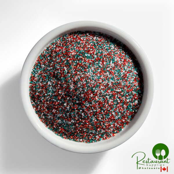 Perfect for Christmas-themed baking, this red, white, and green sugar mix decorates cookies, scones, cupcakes, muffins, and candies with seasonal charm. Create holiday treats that capture the festive spirit and delight customers.