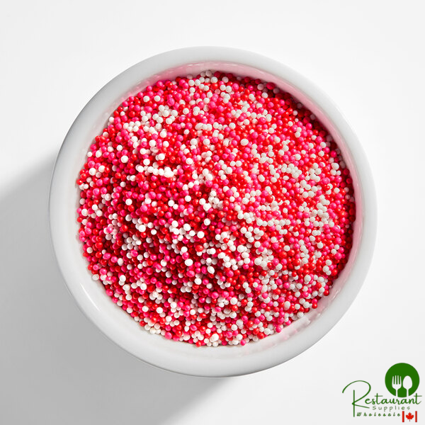 Incredibly fresh, great tasting, and coming at a great value, these nonpareils offer the perfect solution to anyone looking to bring seasonal flair to their holiday treats! This mix features a combination of red, white, and pink nonpareils that are perfect for romantic events like Valentine's Day, anniversaries, and bridal showers. They can easily be mixed with sweet frostings and other toppings or swirled around a cone of soft serve ice cream. Sprinkle these tiny confections into your signature cookie batter, atop a flavorful ice cream sundae, or use them to garnish frosted cupcakes.