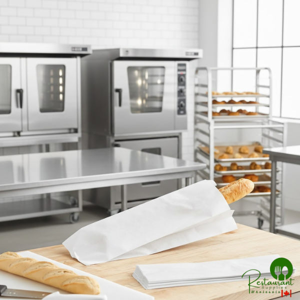 These versatile white bread bags are essential for any bakery, grocery store, or food service establishment looking to maintain the quality and freshness of their baked goods. The generous 18" height and 5 1/4" width provide ample space for various bread types, from delicate rolls to substantial baguettes. The breathable paper construction ensures your baked goods maintain that desirable crispy crust by allowing moisture to escape, while the clean, unprinted white design presents your products professionally. Perfect for merchandising signature sandwiches and bakery items, these bags help drive sales while keeping your products protected and fresh.