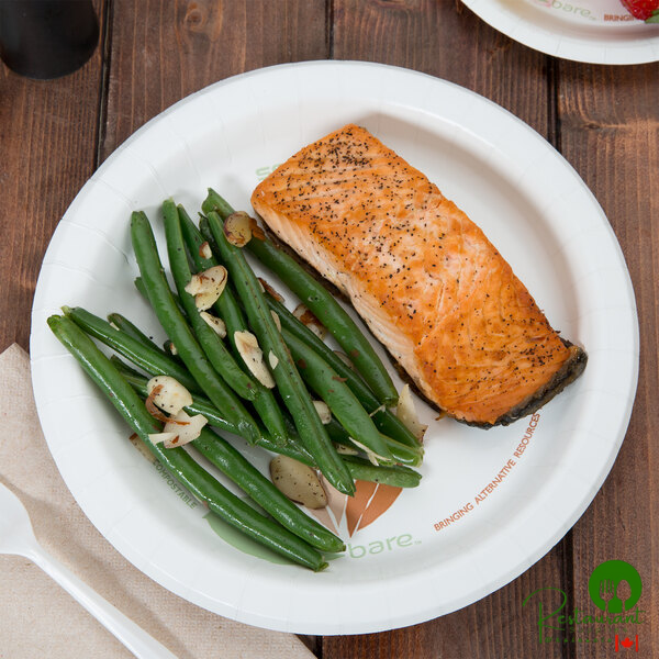 For a sturdy and eco-friendly solution to your heavier food serving needs, use this Bare by Solo 8 1/2" paper plate! With a moisture-resistant varnish over the coated clay paper, this plate is ideal for moist or heavy foods like pasta, meat, pizza, and even salads.