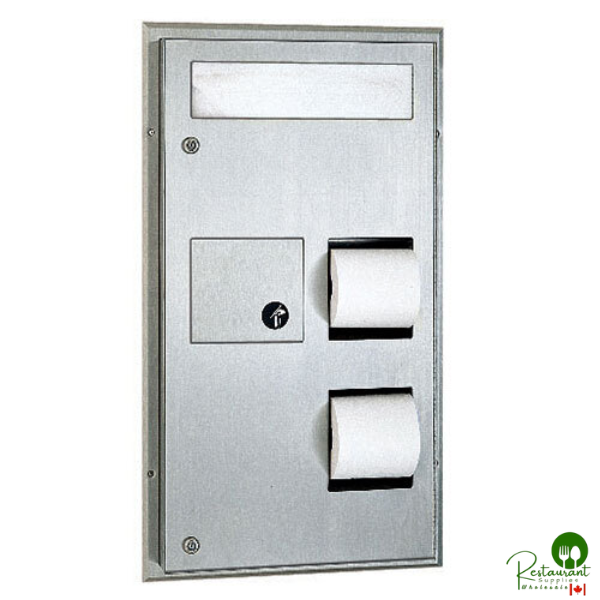 This dual-stall partition mounted dispenser combines seat covers, sanitary napkin disposal, and toilet tissue dispensing in one efficient unit. Designed to serve two restroom stalls simultaneously for maximum space utilization.
