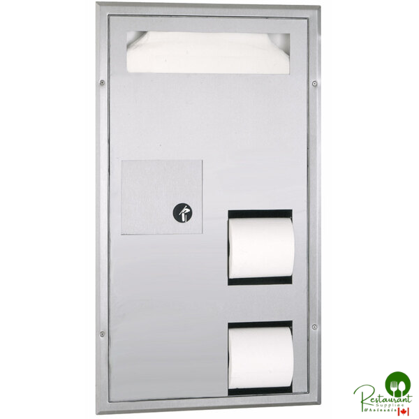 Designed for partition mounting between accessible and standard restroom compartments. The flush-mounted accessible side allows for horizontal grab bar installation while providing comprehensive hygiene amenities including sanitary waste disposal for enhanced user convenience and safety.