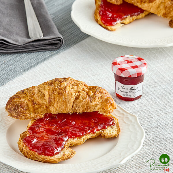 Add a premium offering to your establishment with these Bonne Maman 1 oz. strawberry preserves! This product is made with the highest quality strawberries available, which are cooked whole and sweetened before they're jarred. These preserves feature fruit pieces with delightfully crunchy strawberry seeds and a sweet, ripe, juicy strawberry flavor. With their distinctive packaging featuring Bonne Maman's recognizable, gingham-patterned lid, these strawberry preserves add a classic appearance to your breakfast service or displays in your front of house.