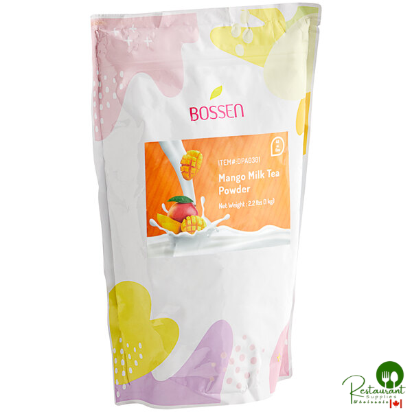 This Bossen all-in-one mango milk tea powder mix is stored in a convenient 2.2 lb. bag that features a resealable top to lock in the product's freshness. This product is shelf stable, making storage simple and saving valuable refrigerated space. Best of all, each bag makes approximately (16) 16 fl. oz. prepared milk tea beverages to offer an ample supply for your busy establishment!