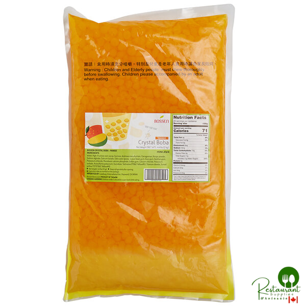 This Bossen mango crystal boba offers an easy way to create trendy bubble teas or add tantalizing texture to your signature beverages or frozen yogurt! Also known as agar boba, this crystal boba is made from konjac, a plant native to eastern Asia, to create chewy, jelly-like pearls that are sweetened with a syrup flavored with mango.