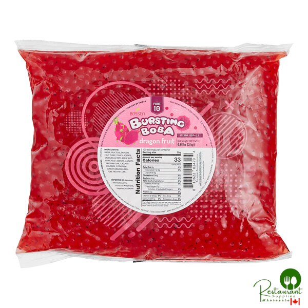 With this Bossen Pure10 dragon fruit bursting boba, creating trendy bubble teas and other delicious beverages has never been easier! This caffeine-free and vegetarian boba is made in traditional Taiwanese style and it's filled with a luscious, juicy dragon fruit flavor! Each boba pearl is packed with 10% juice that bursts with a refreshing flavor when bitten into, giving a dynamic texture to your beverage or dessert.