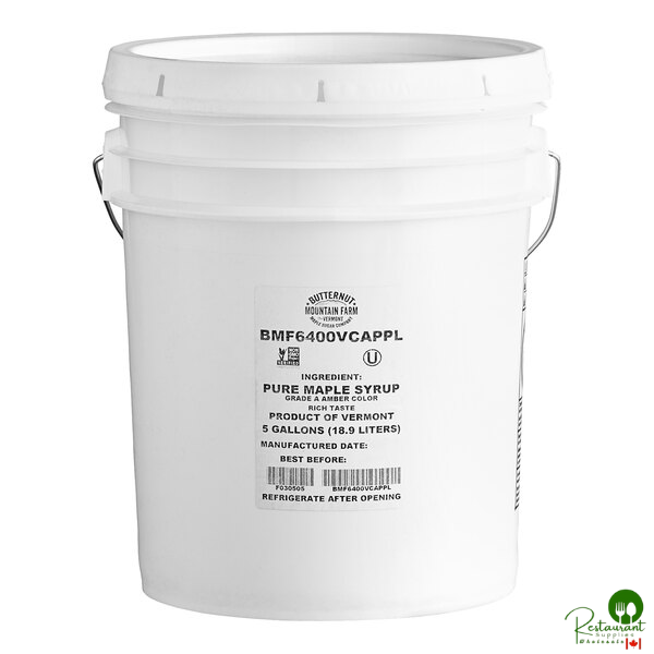 Tapped from Vermont maple trees renowned for their vibrant fall foliage comes Butternut Mountain Farm 5 gallon grade A amber pure Vermont maple syrup. As a completely versatile ingredient, you'll be able to add this maple syrup to almost all of the items on your a la carte, dessert, or drink menu.