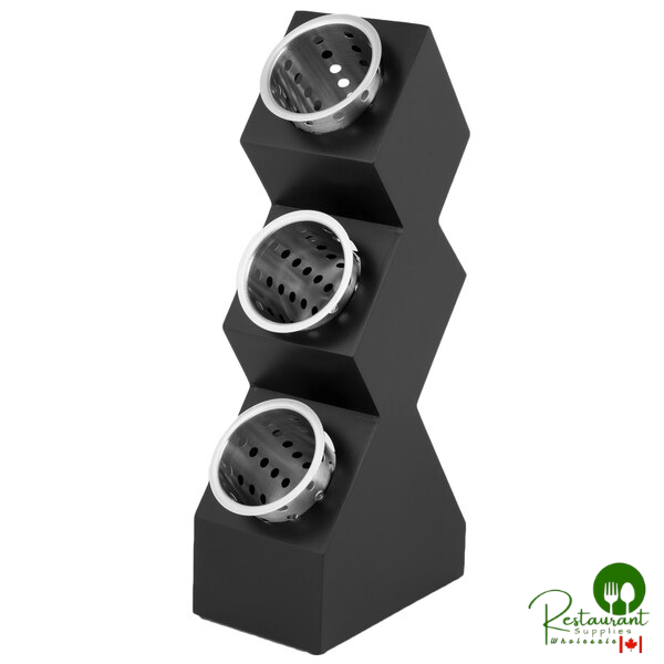 Enhance your flatware or condiment displays without sacrificing style with this sleek, vertically-designed three compartment condiment holder. Its eye-catching base features a zig-zag frame with room for three storage cylinders for offering sugar, artificial sweeteners, non-dairy creamers, coffee stirrers, or flatware. Your customers will appreciate the convenience of having everything they need right at their fingertips.