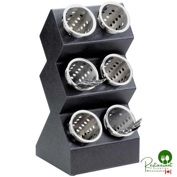 The distinctive zig-zag frame in classic black provides a modern backdrop for six storage cylinders (sold separately), creating an organized display for flatware, condiment packets, creamers, and sugar containers.