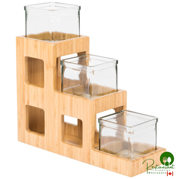 The tiered bamboo design with clear glass jars allows customers to easily identify contents while adding a touch of natural elegance to your service area.