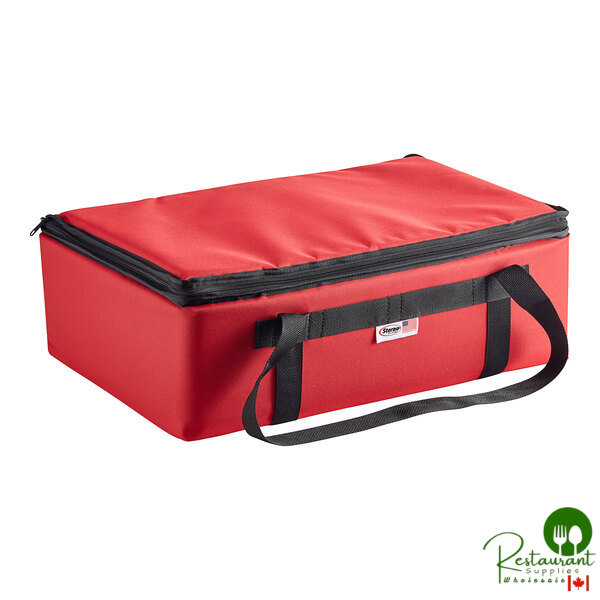 The red nylon exterior provides a practical and professional appearance that represents your business well during customer interactions. The clean, modern design complements various food service environments while ensuring functionality and durability.