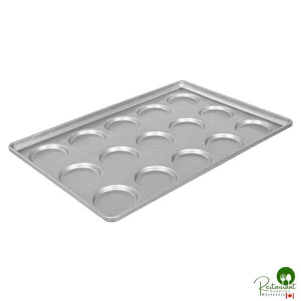 Professional 15-compartment aluminized steel baking pan designed for hamburger buns, muffin tops, and cookies. Features commercial-grade construction with superior heat transfer for consistent baking results.
