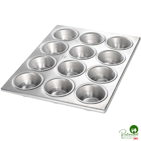 Professional-grade 12-cup muffin pan crafted from heavy-duty 20-gauge aluminum. Features wire-reinforced rim and square corner construction for maximum durability in commercial baking operations.