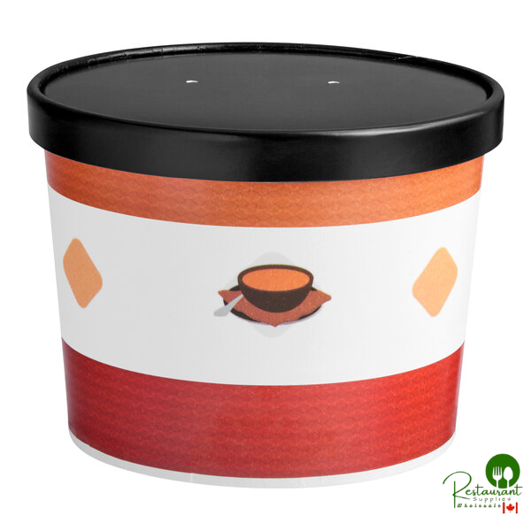 This Choice 64 oz. Medley double poly-coated paper cup with lid provides a great presentation for your hot take-out food items! Designed with both functionality and aesthetics in mind, this container elevates your food service while keeping contents hot and secure.
