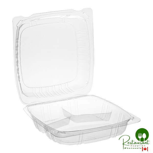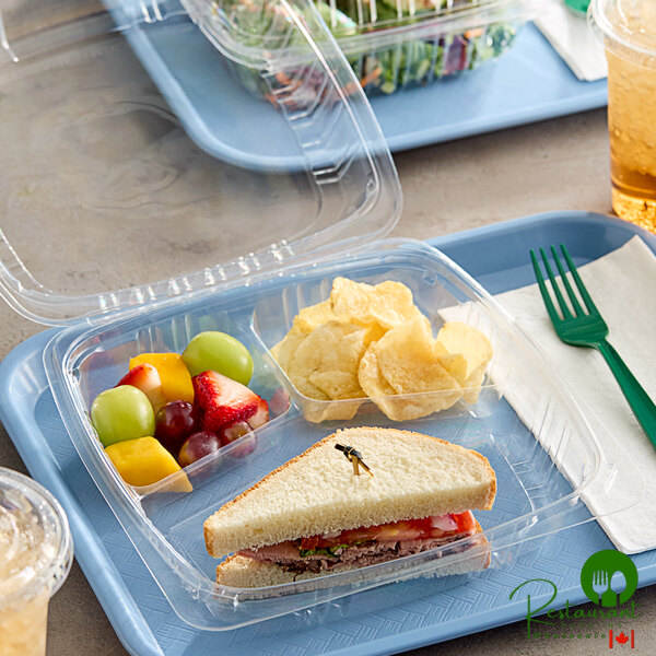 Guarantee secure food transport and superior visibility with this premium clear hinged plastic clamshell container featuring three convenient compartments.