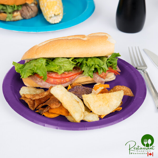 This Creative Converting 318927 8 7/8" Amethyst round paper plate brings a vibrant splash of color to your party, buffet, snack bar, or catered event!