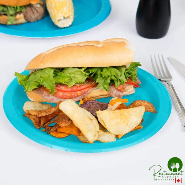 This Creative Converting 471039B 8 7/8" Bermuda Blue round paper plate is perfect for your party, buffet, snack bar, or catered event!