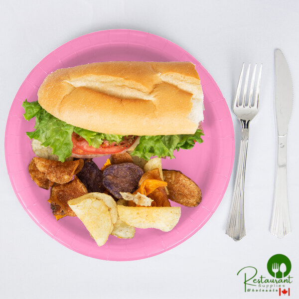 This Creative Converting 473042B 8 7/8" Candy Pink round paper plate is perfect for your party, buffet, snack bar, or catered event!