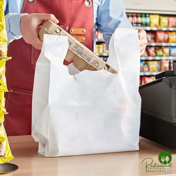 Use these Prime standard size 2.25 mil white unprinted reusable extra heavy-duty plastic T-shirt bags to effectively package a variety of products while providing your customers with a convenient, durable carrying solution.