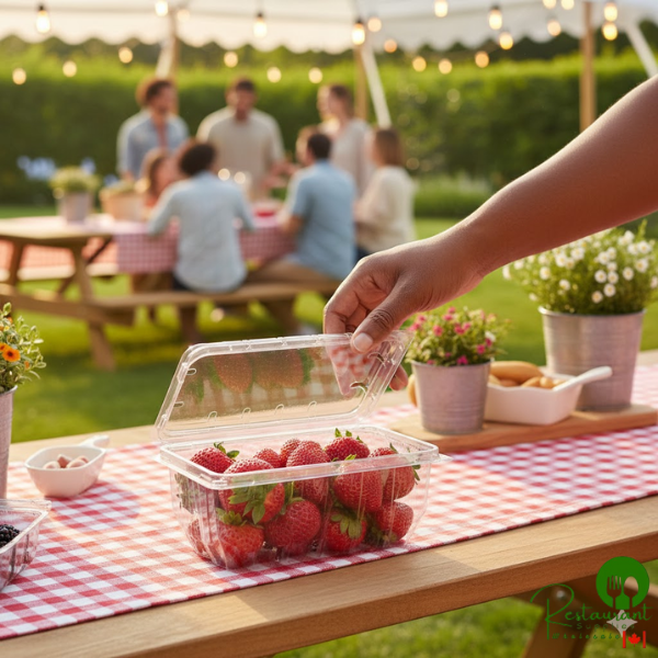 This container merchandises blueberries, raspberries, cherry tomatoes, and fresh herbs. It features a rippled texture to protect produce and a hinged lid for easy storage. Perfect for produce stands, markets, bakeries, and restaurants.