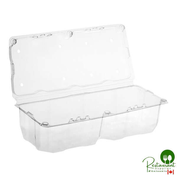 Crystal-clear PET construction offers optimal visibility for customers. The attached hinged lid provides convenient organization. Perfect for produce stands, markets, and grocery stores, this container maintains quality and presentation of your produce items.