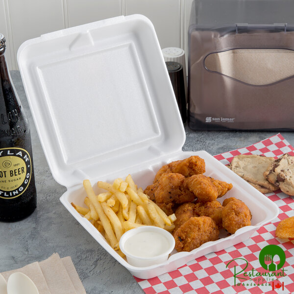 Convenient and efficient, this Dart 80HT1R white foam square container is perfect for your take out service or packaging patrons' leftovers. From to-go cheesesteaks to cold cut subs, this all-purpose clamshell container is reliable and convenient for your business.