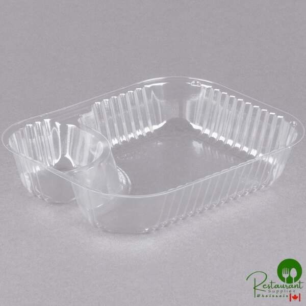 Serve up mouthwatering nachos in this Dart C68NT2 two-compartment large nacho tray. Made of clear plastic, this tray creates an attractive presentation that lets customers see the warm, fresh melted cheese and toppings. With ribbed siding for extra strength, this nacho tray is ideal for stadiums, concession stands, food trucks, or any venue where customers are on the go.