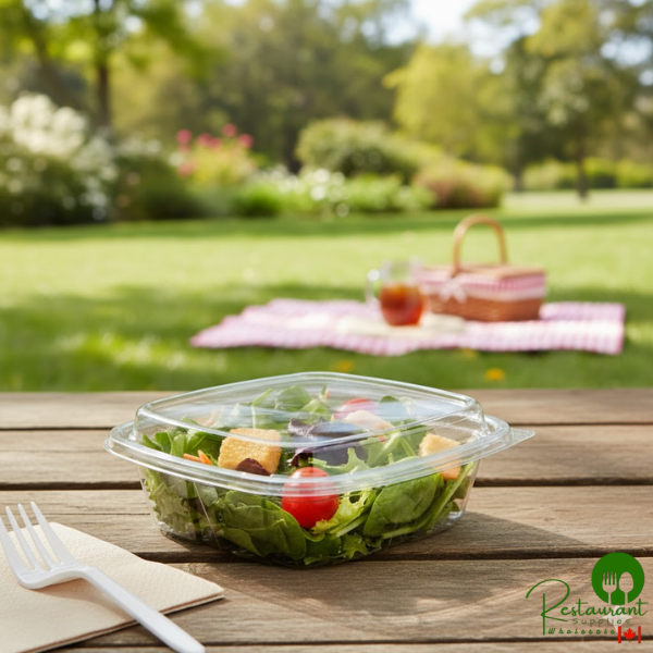 This PET plastic container's tamper alert hinge remains attached to the container, eliminating loose plastic pieces as well as the need for shrink bands and wrap labels - saving your business time and money, all while reducing waste. Use this container to hold bulk food, dips, salads, granolas, fruits, and veggies at your deli, salad bar, or grab-and-go counter.