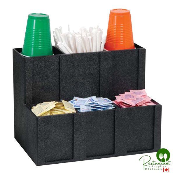 This Dispense-Rite black polystyrene 6-section countertop organizer streamlines your service area by holding cups (6-44 oz.), lids, straws, stir sticks, and condiment packets in one efficient unit. Features removable front panels for custom configurations to meet specific organizational needs.