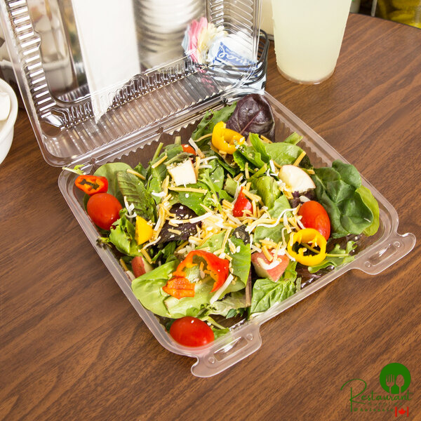 Send desserts, pastries, salads, and specialty sandwiches home with your customers in this clear hinged container! The 8" x 8" x 3" size is perfectly proportioned for a wide variety of products.