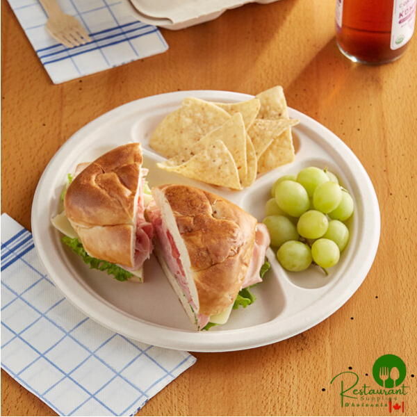 If you're looking for the convenience of disposable products without the environmental impact of plastic or foam, the EcoChoice 10" 3-Compartment Plate is your perfect solution. Perfect for both hot and cold foods, this plate is an ideal solution for restaurants, caterers, and sandwich shops that serve anything from hot entrees to cold salads and dessert dishes. Serve up lunch or dinner plates, sandwiches, desserts, and more on this versatile 10" plate with three organized compartments that make meal service efficient and appealing.