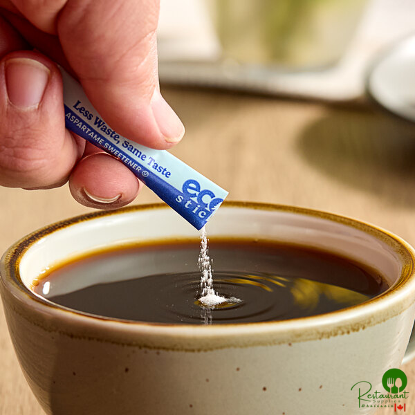 Provide a sweetener option that tastes great and is great for the planet with this ecoStick blue aspartame sugar substitute packet! Made with aspartame, this product is a zero-calorie way to sweeten your beverages. Delivering sweetness equivalent to 1 tsp. of sugar, this product is a great addition to your restaurant, bar, or coffee shop. You can even offer it at your hotel's breakfast bar or in your hotel rooms for a great way to enjoy a little sweetness during your guests' stay. This sugar substitute is great for adding a sweet flavor to coffee, tea, and other beverages, or for sprinkling on cereal or fresh fruit.