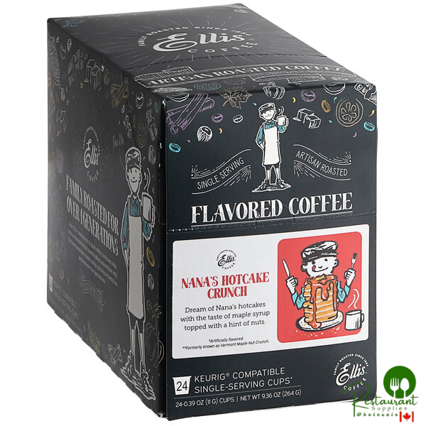 Delight your customers with the unique and enticing flavors of these Ellis Mezzaroma Nana's Hotcake Crunch coffee single serve cups! For over 150 years, Ellis Coffee Company has followed the tradition of providing customers with high-quality and great tasting products. This flavored coffee combines sweet, maple flavor with smooth, nutty essence to create a decadent, full-bodied blend. Extra creamy and richly satisfying, this medium roast, maple nut blend is a great addition to your specialty coffee offerings.