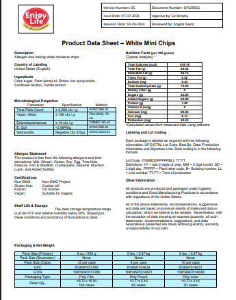 With these Restaurant Supply Wholesale Canada white vegan 4M chocolate chips, you can serve delicious rich, indulgent white chocolate desserts with confidence, knowing they're free from all 14 major allergens! These plant-based white chocolate morsels contain no animal products, making them suitable for your vegan and vegetarian patrons. In fact, they're made with all-natural ingredients including vanilla extract, rice syrup, and unrefined cane sugar! Their sweet and creamy white chocolate flavor is perfect for creating classic treats without the dairy. Best of all, they're processed in a nut- and gluten-free facility on a dedicated dairy- and soy-free line - so whether you're creating desserts for your gluten-free customers or creating delicious vegan treats, these chocolate chips are the perfect choice.