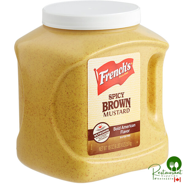 Perfect for those who like their mustard with a little extra kick, offer your guests this French's 105 oz. spicy brown mustard to accompany your signature foods. Made with #1 grade mustard seeds, distilled vinegar, and no artificial flavor or preservatives, this lively condiment has a more coarse texture and pungent flavor than Dijon mustard, and delivers a more pronounced, lingering heat that is sure to please.