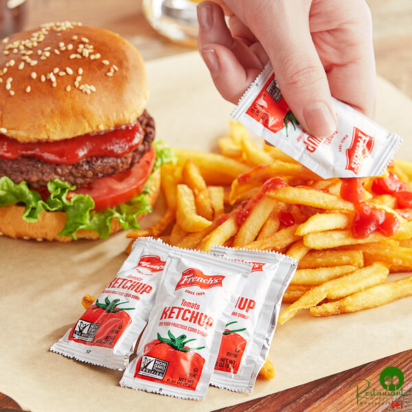 Enhance the flavor of virtually any recipe with the iconic taste of these French's 9 gram tomato ketchup packets! The ketchup is made with all-natural ingredients including fresh, ripe tomatoes, sugar, onion powder, and a variety of herbs and spices to deliver a sweet and tangy tomato flavor. It does not contain any high fructose corn syrup, as well as any artificial flavors, colors, or preservatives.