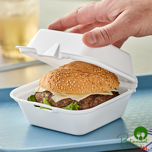Streamline your takeout service with this Genpak white hinged lid foam container. Made of foamed polystyrene, this clamshell container is conveniently lightweight but still able to support heavy foods.