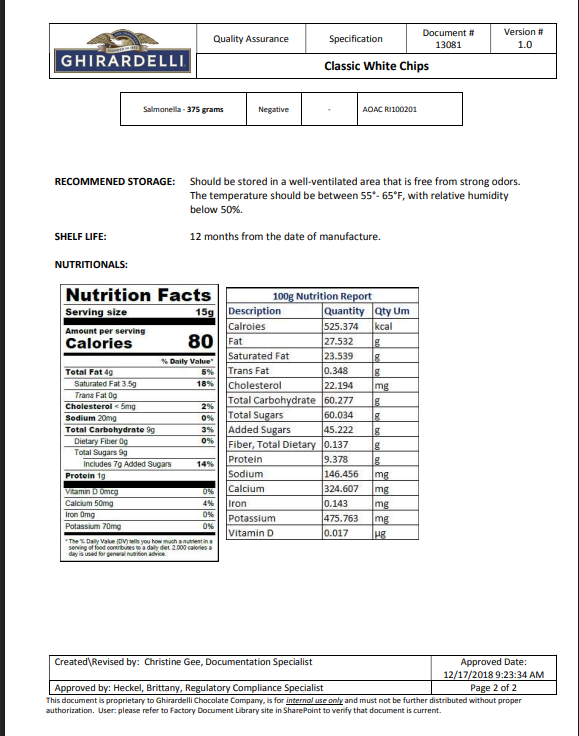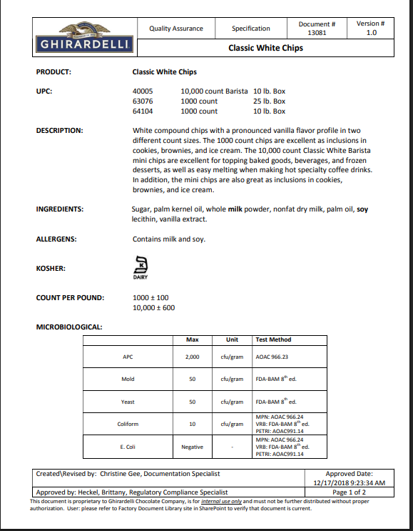 Add texture and flavor to baked goods with these Restaurant Supply Wholesale Canada 10 lb. classic white 1M baking chips! With a standard size of 1M, meaning there are 1000 chips per lb., they are perfect for sprinkling throughout a variety of decadent desserts. Featuring a sweet and creamy vanilla flavor, they'll make a great addition to cookies, cakes, and blondies, and they pair well with fruit. Indulge your guests with pancakes, scones, and confections made with these irresistible white chips. You can even use them for decorating, garnishing, or topping an iced drink or specialty frozen drink.