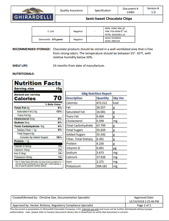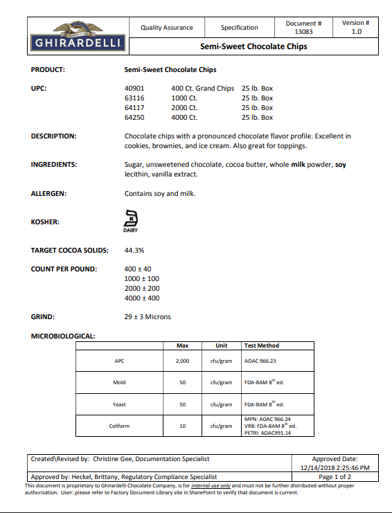Add texture and flavor to baked goods with these Ghirardelli 35 lb. semi-sweet chocolate 2M baking chips! With a size of 2M, meaning there are 2000 chips per lb., they are perfect for sprinkling throughout a variety of decadent desserts. Compared to milk chocolate, semi-sweet chocolate uses half as much sugar as cocoa to yield its own distinct taste. Though it is not as sweet as milk chocolate, it is great for cooking and baking purposes. Add them to the pantry in your bakery, restaurant, or cafe to incorporate decadent chocolate flavor into your menu!