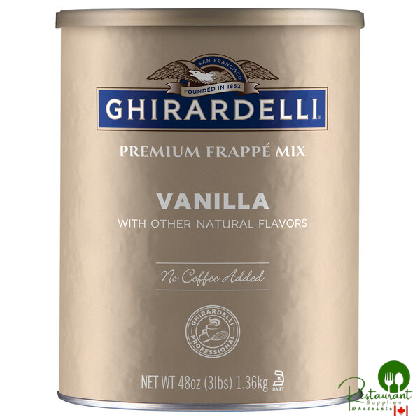 Inspired by the taste of slow-churned vanilla ice cream, this base is made with real Madagascar bourbon vanilla and hints of vanilla bean seeds. Customers will recognize and trust the Ghirardelli name when they see it in your cafe, coffee shop, ice cream parlor, or restaurant. Not only is this great for making frappes and milkshakes, but it can be made hot or poured over ice, too. Add your choice of fruits, flavoring sauces, or chocolate chips to make profitable, eye-catching drinks that your guests won't be able to resist. No matter what drinks you prepare, guests are in for a treat with this vanilla flavored frappe beverage base!